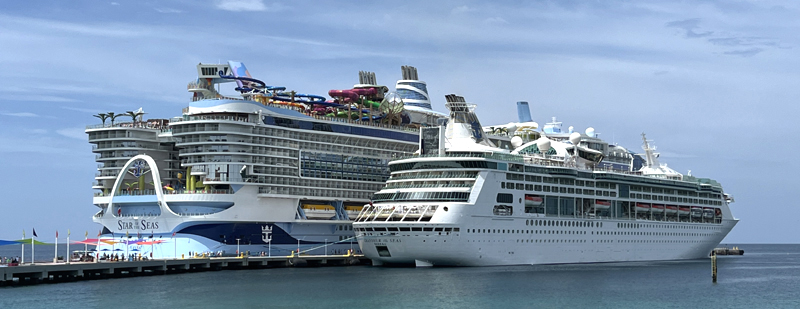 Jak potężny jest Star of the Seas dobrze widać, gdy zacumowany jest obok "zwykłego" wycieczkowca. W tym przypadku jest to Grandeur of the Seas, który ma 279 m długości i zabiera na pokład 2446 pasażerów oraz 760 osób załogi.