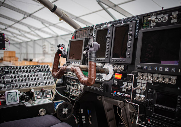 Pilot drona siedzi na ziemi, ale jego miejsce pracy wygląda jak kokpit nowoczesnego samolotu.